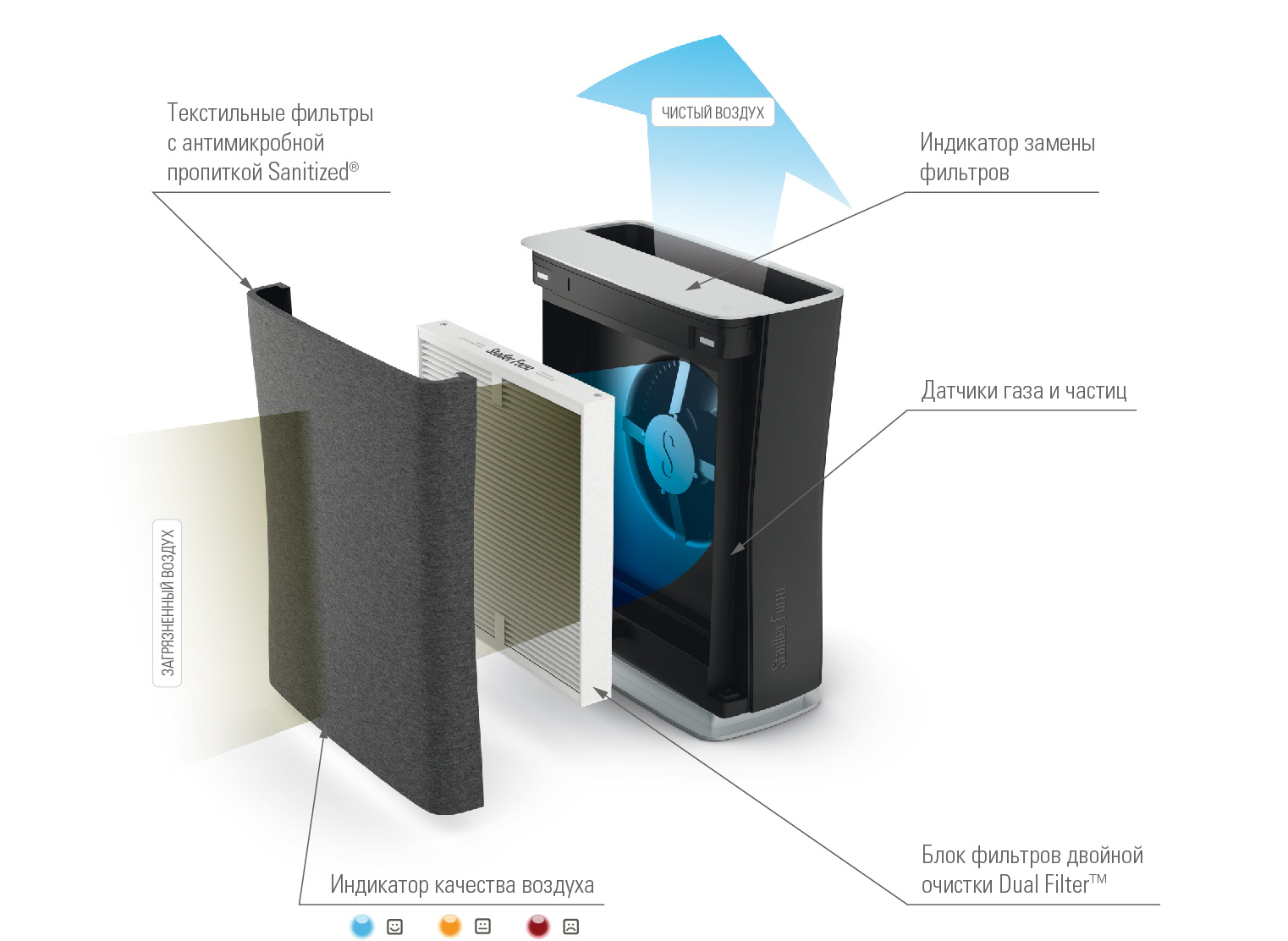 Технология Dual Filter™ представляет собой комбинацию HEPA-фильтра и угольного фильтра. HEPA-фильтр удаляет из воздуха такие загрязняющие вещества, как мелкая пыль, пыльца, вирусы и бактерии. Угольный фильтр – мастер по устранению неприятных запахов. Он адсорбирует находящиеся в воздухе газы (неприятные запахи, табачный дым, формальдегид, толуол, летучие органические соединения и т. д.).